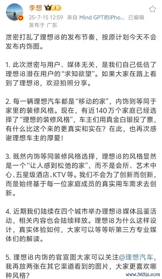 新浪科技讯 7月15日下昼音信,当天,理念念汽车CEO李念念发文称,“泄密打乱了理念念i8的发布节拍,按原霸术今天不会发布内饰图。这次泄密与用户、媒体无关,是咱们我方低估了理念念i8潜在用户的‘肄业空想’。要是宇宙在路上看到了理念念i8,接待拍照共享。” 李念念谈到,每一辆理念念汽车齐是“挪动的家”,内饰则等同于家里的装修作风。当今,有近140万个家庭仍是选拔了“理念念的装修作风”,车主们用真金白...