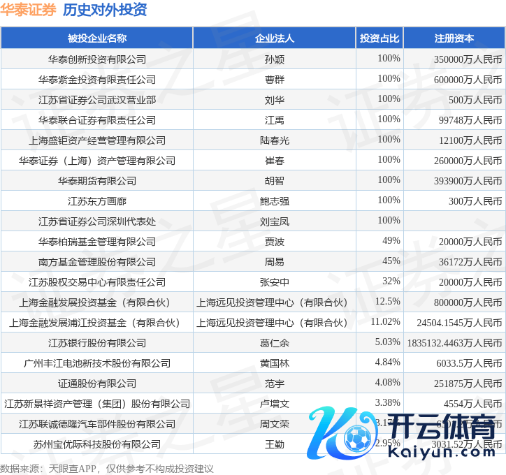 本站音信,左证天眼查APP显现,华泰证券(601688.SH)新增一谈对外投资事件,被投资公司为济南圣泉集团股份有限公司,法定代表东谈主唐一林,投资占比为1.2%。该公司从事化学原料和化学成品制造业,注册成本为84640.1998万东谈主民币。当今,华泰证券共存在对外投资127项,投资占比前20的名目见下表:
