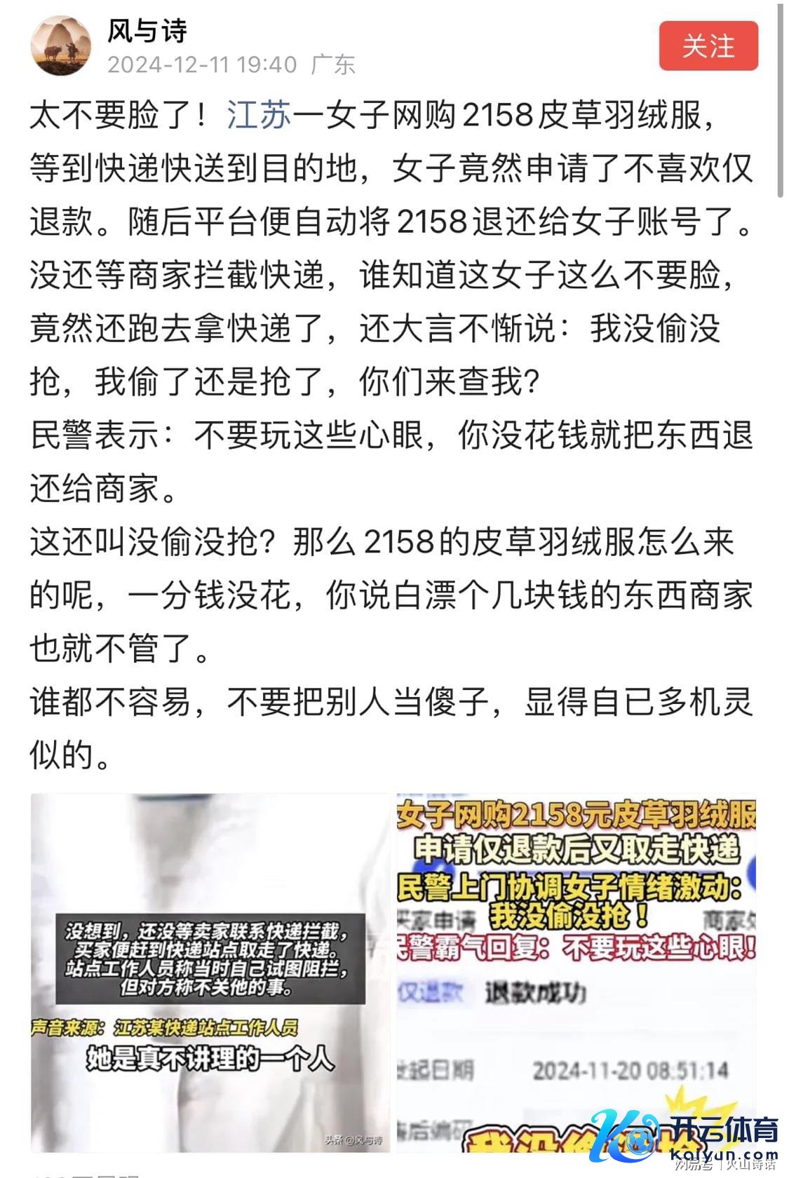 近日有网友发帖称九游体育app娱乐,太不要脸了!江苏一女子网购2158皮草羽绒服,比及快递快送到商酌地,女子果然苦求了不可爱仅退款。随后平台便自动将2158元退还给女子账号了。